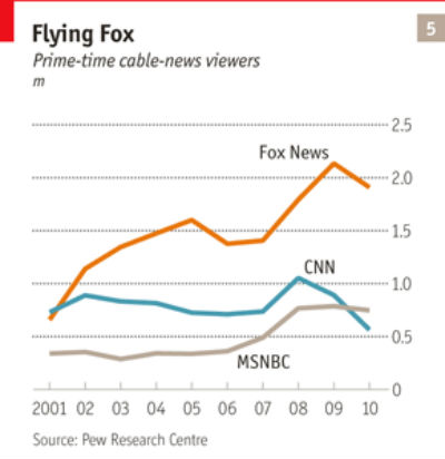 Може, саме через це MSNBC, яка нещодавно заявила про свою спрямованість на ліву аудиторію, збільшує кількість глядачів. «Це не така політична заангажованість, як у Fox, - каже Філ Гріффін, президент MSNBC, - але ми однозначно нарощуємо наші симпанії до лівих».