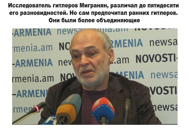 Date: 2014-04-05 10:29 am (UTC)Газета «Известия» опубликовала большую программную статью политолога Андраника Миграняна, в которой четко сказано – Россия не должна рефлексовать по поводу сравнения в западных СМИ образов Путина и Гитлера. Потому что (внимание!) Гитлер – «политик высочайшего класса», который «был славен тем, что занимался собиранием земель,… фактически завершив то, что не удалось Бисмарку».
